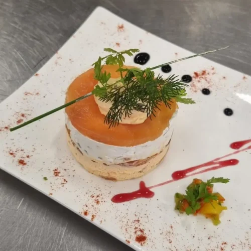 Bavarois de saumon fumé écrasé de ratte et aneth avec mousse de chèvre et poivre,